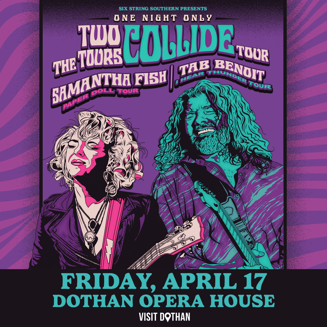 We’re thrilled to partner with Six Strings Southern Productions and the Dothan Opera House to bring you an unforgettable night of blues featuring Tab Benoit and Samantha Fish — two powerhouse artists sharing one incredible stage!